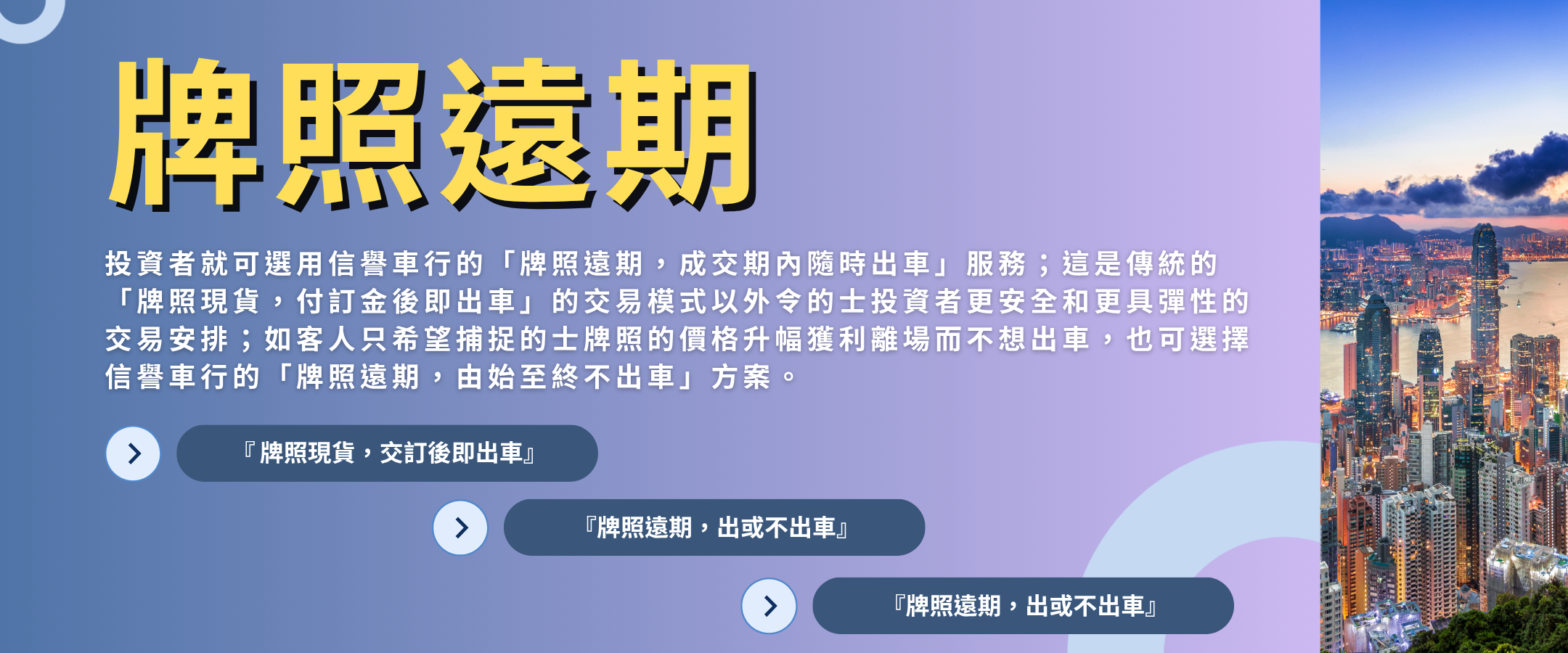 如客人只希望捕捉的士牌照的價格升幅獲利離場而不想出車,也可選擇信譽車行的「牌照遠期,由始至終不出車」方案。